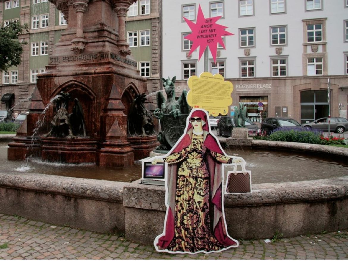 M wandelte am 30. Juli 2012 als Pappfigur durch Innsbruck und diskutierte im Kreise der historischen Superhelden mit InnsbruckerInnen über Raum als Bedeutungsträger und eröffnete feierlich ihr Denkmal in der Bäckerei – Kulturbackstube, wo sie bis März 2013 blieb.