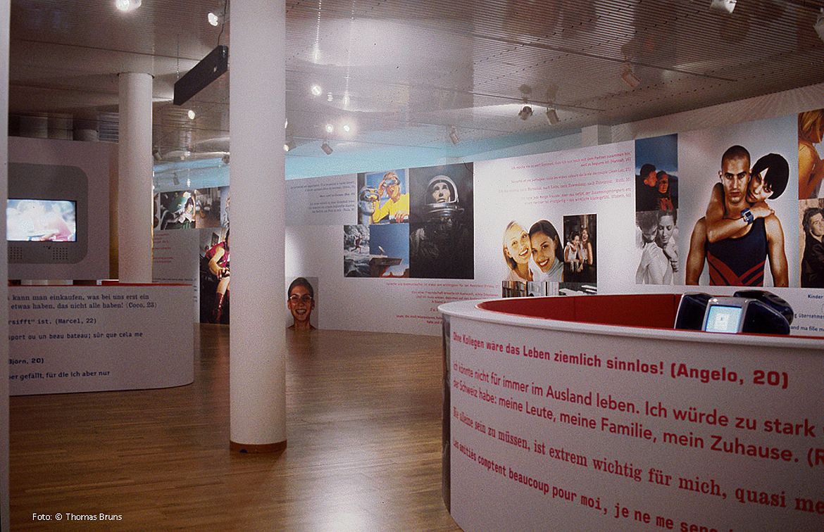 Drei in der Höhe übereinander angeordnete Plotbahnen ermöglichen verschiedene Bildformate, Ausstellungsmöbel und unterschiedliche Räume zu generieren. Sie stellen einen Bilddatenstrom im Raum dar. Dieser formt folgende Elemente im Ausstellungsraum: