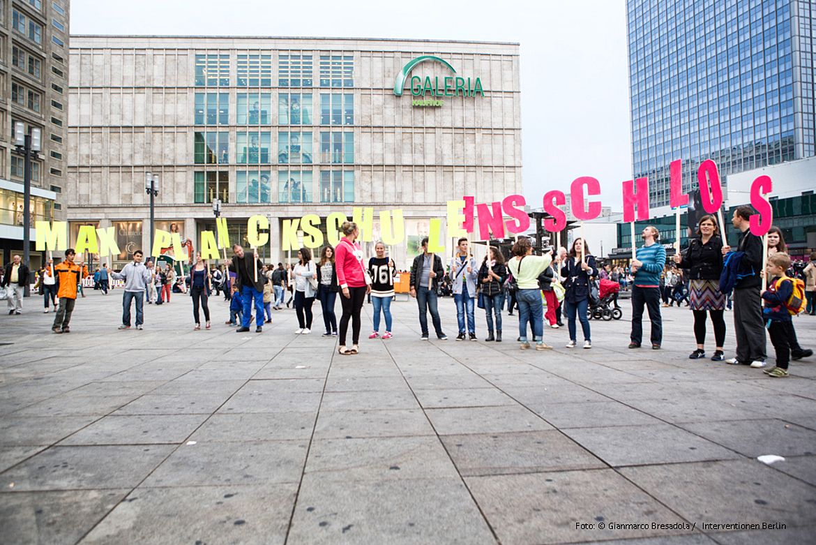 Die Intervention am Alexanderplatz besteht darin, Schlüsselwörter oder ganze Nachrichten im Stadtraum zu visualisieren. Für den Workshop werden Buchstaben und Zeichen teilweise vorgefertigt und auch von den Jugendlichen selbst gebaut oder modifiziert. Es werden verschiedene Choreografien überlegt, wie man die einzelnen Buchstaben zu Wörtern und die Wörter zu Sätzen bzw. Nachrichten fügt.